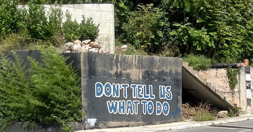 Now I'm not telling about some person saying to another who is in danger, “Don't drive that way because the bridge has collapsed.” Thats not the kind of telling what to do that the graffitist or I take issue with. I'm talking about someone presuming they have the right to tell (or even order or compel) other people to do this or that, or that other people should be obliged to do it because of the position or power of the person doing the telling.