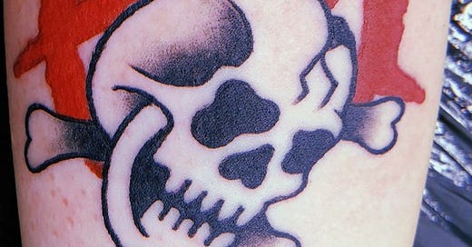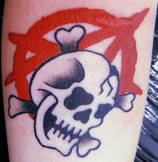 This time of year my arms are hidden underneath a warm coat, but when the sun comes out and it is t-shirt weather you might just glimpse a tattoo underneath my left arm. It is a black Skull and crossbones resting on a red A surrounded by a circle. It was designed by my cousin Craig, who usually does more elaborate body art, but I wanted something simple that symbolised my outlook on life.